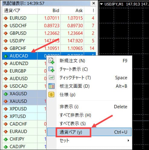 まずはMT4を開いて「気配値で右クリック」をし、「通貨ペア」を選択します。
