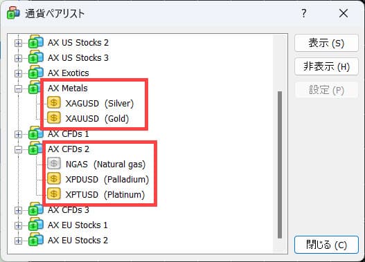 シルバーも同じ箇所にありますが、パラジウムとプラチナは「AX CFDs2」にあるので気を付けましょう。