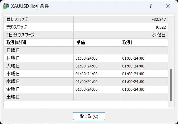閉場時間はFXと同じです。