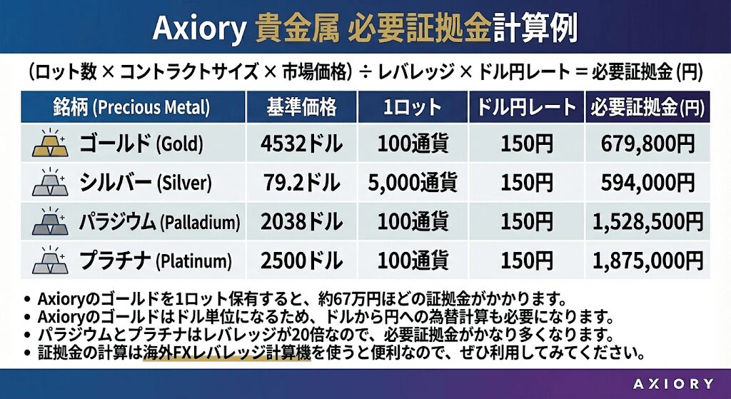 ゴールドやシルバーのレバレッジは100倍となり、パラジウムとプラチナは20倍のレバレッジとなります。