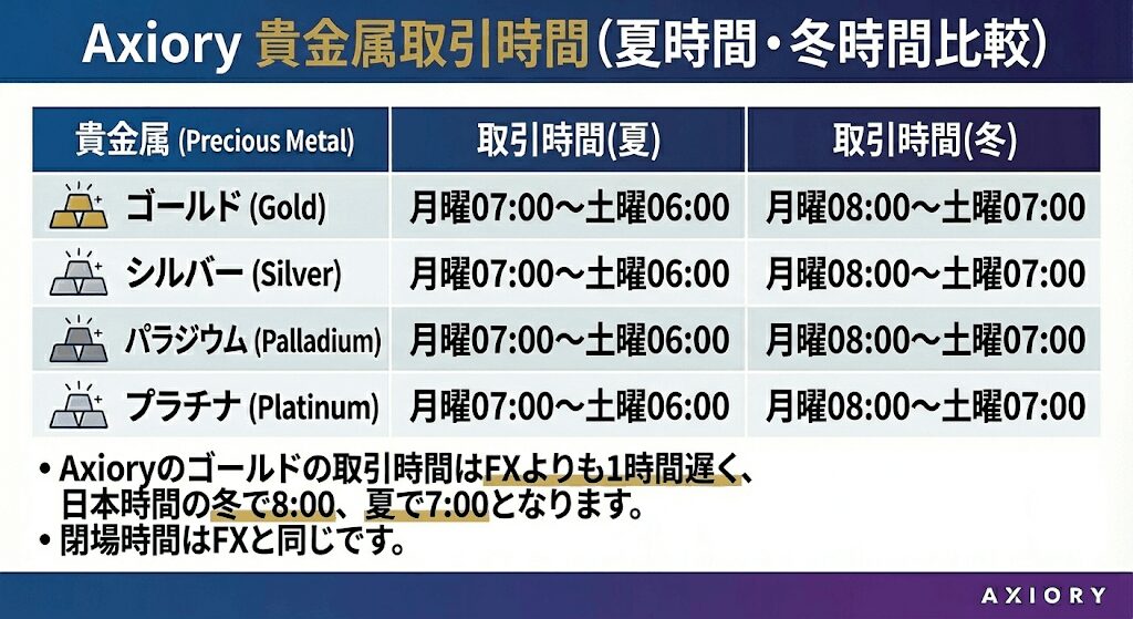 Axioryのゴールドの取引時間はFXよりも1時間遅く、日本時間の冬で8:00、夏で7:00となります。