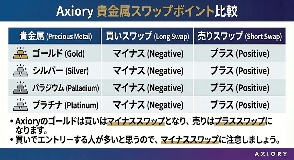 Axioryのゴールドは買いはマイナススワップとなり、売りはプラススワップになります。