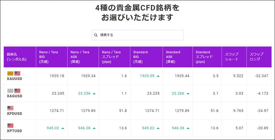 ゴールドやシルバーなどの貴金属のスプレッドです。