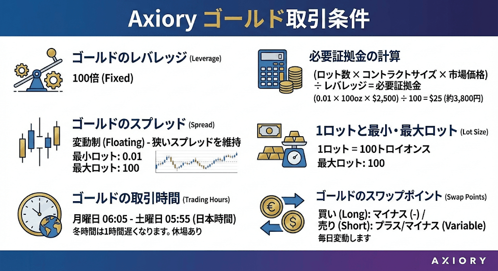 このページではAxioryのゴールドの取引方法や取引条件(レバレッジやスプレッド、1ロットの通貨数)などを紹介して行きます。