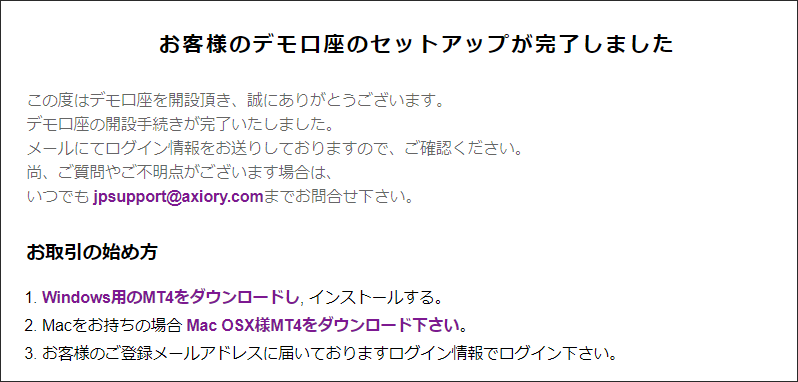 メールを確認すると「お客様のデモ口座の開設が完了しました」というメールが来ています。