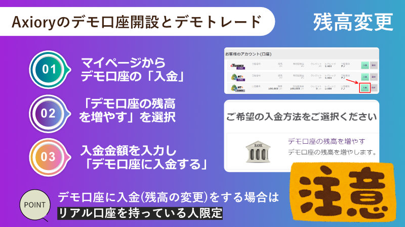 リアル口座を持っていれば残高変更も簡単で、デモ口座はAxioryを使うと良いと思います。