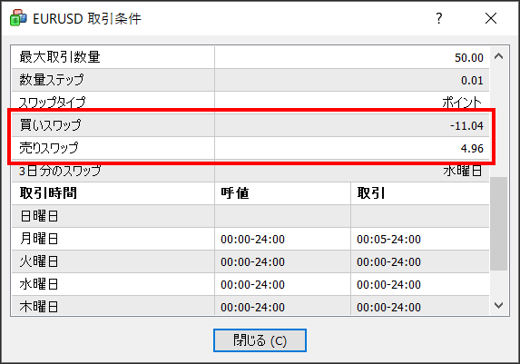 表示されているスワップポイント(4.96) × 107.94(右側の通貨の金額) = スワップポイント(535円)