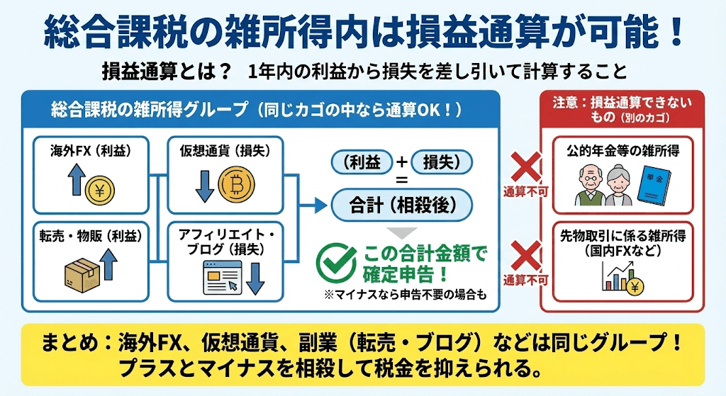 雑所得は他の所得と損益通算はできませんが、総合課税の雑所得内での損益通算は認められています。