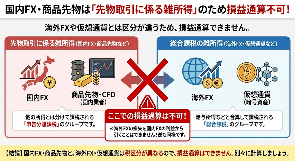 国内FXや商品先物は先物取引に係る雑所得のため損益通算不可