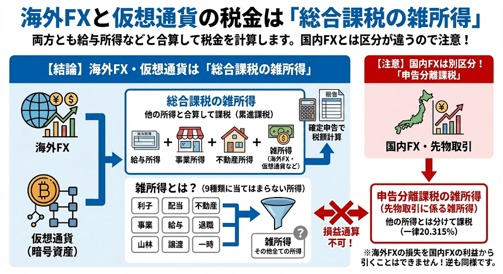 海外FXと仮想通貨は同じ「総合課税の雑所得」となり、損益通算することが可能です。
