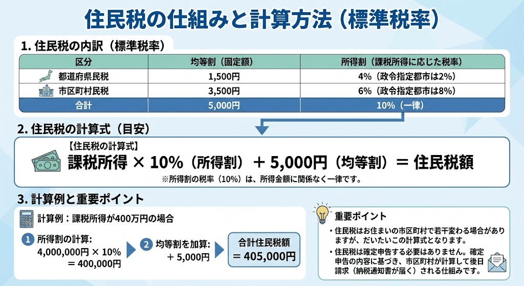 住民税はお住まいの市町村で変わりますが、だいたいこの計算式となります。