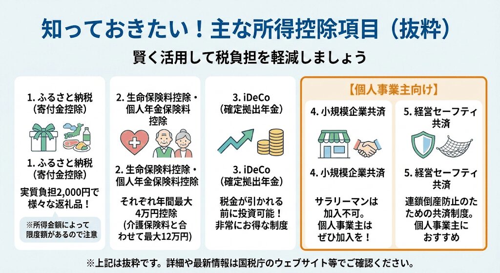 経費と控除は以下のページで詳しく紹介しているので参考にしてください。