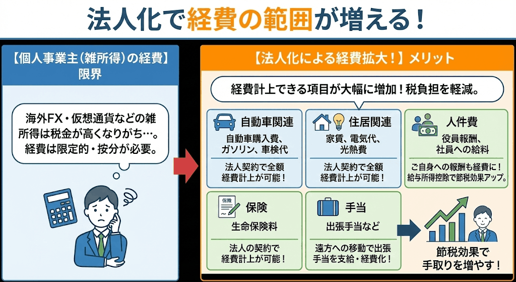 海外FXや仮想通貨などの雑所得の場合は税金が高くなりがちですが、法人化をすることで経費の範囲が増えます。