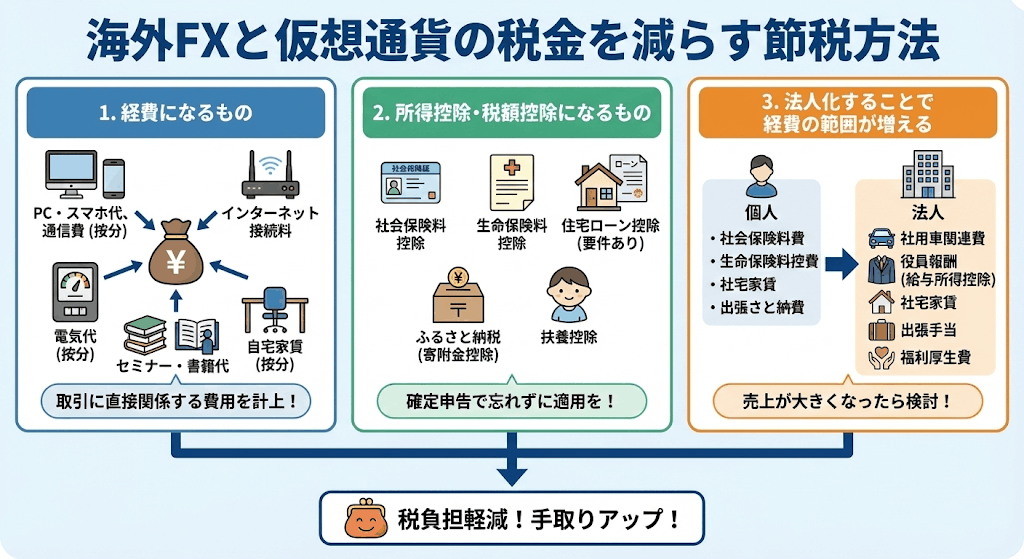 海外FXや仮想通貨は雑所得のため控除が少なく、税金が高くなりがちです。