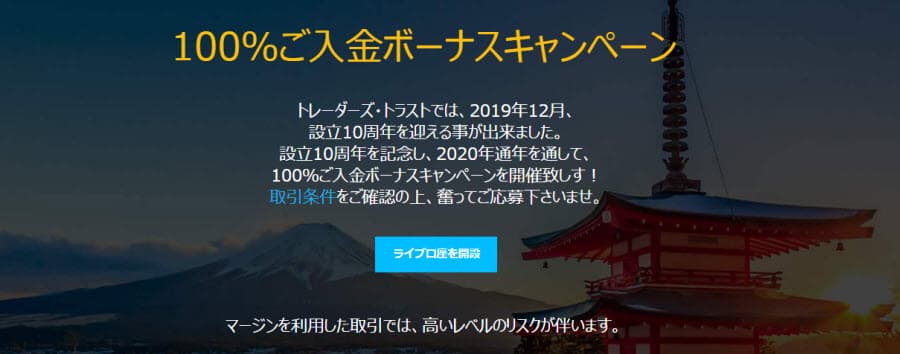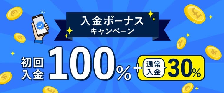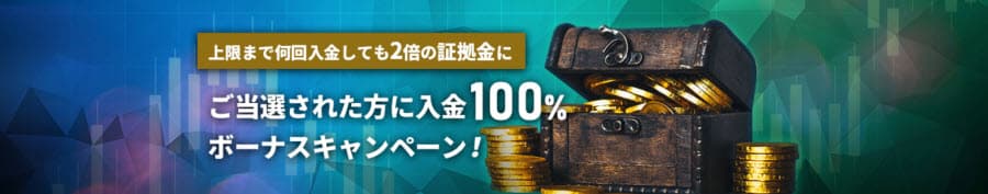 入金100%のボーナスが付き、入金10万円からボーナスがもらえます。