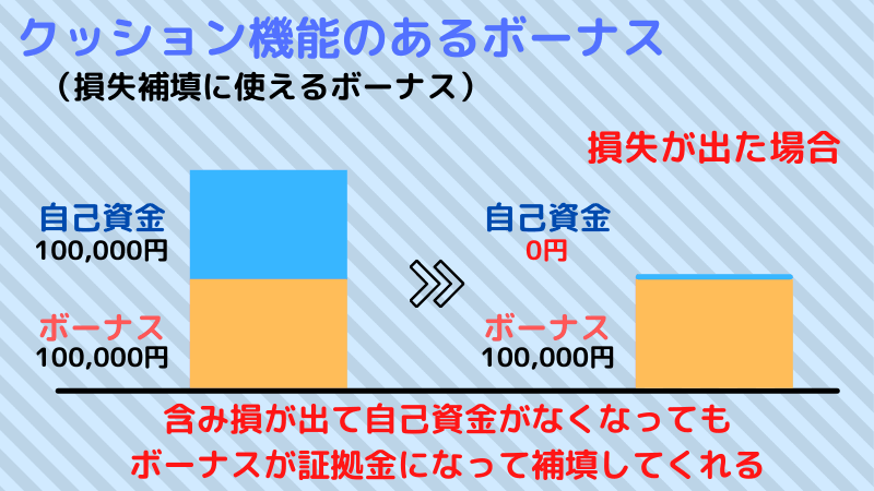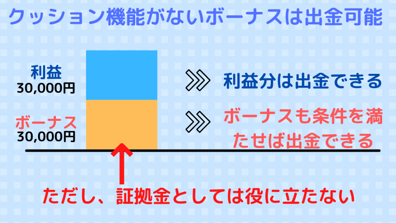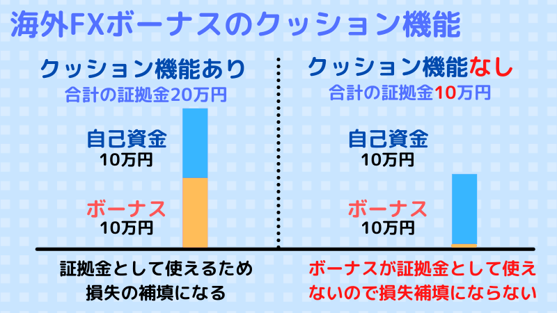 通常はクッション機能があることが前提だと思いますが、海外FX業者の中にはクッション機能のないボーナスも存在しますので、それぞれ説明していきます。