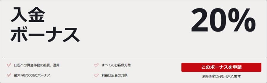 最低入金額が20万円で少しハードルが上がりますが、より多くのボーナスを利用することが可能です。