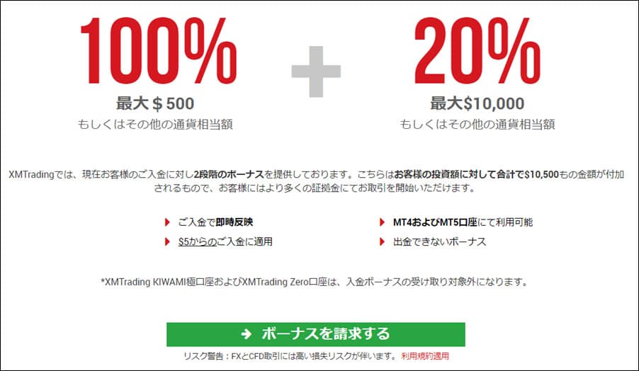 XMの入金ボーナスもクッション機能があり、500ドルまでの入金は100%、それ以上は1万ドルの20%のボーナスが付きます。