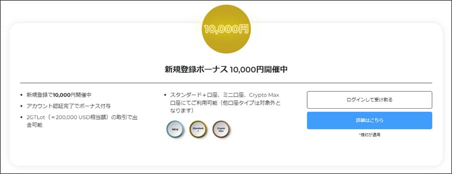FXGTでは口座開設をすると1万円のボーナスがもらえます。