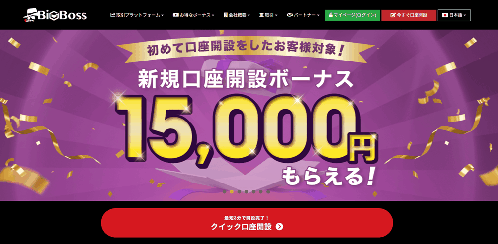 BigBossの口座開設ボーナスは常時開催となり、金額は1.5万円になります。