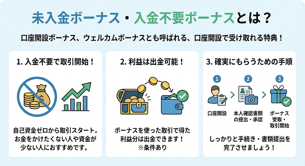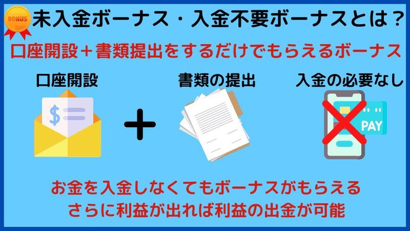未入金ボーナスは口座開設と書類の提出をするだけでもらえるボーナスで、リスクなく資金を増やせるチャンスです。