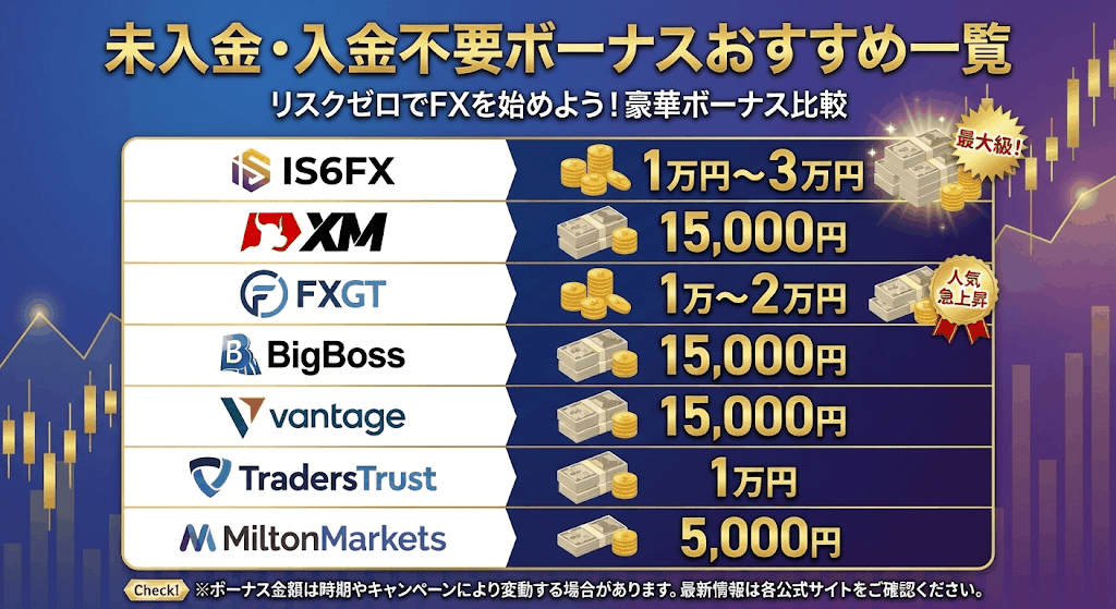 海外FXの未入金ボーナス・入金不要ボーナスのおすすめ業者を紹介していきます。