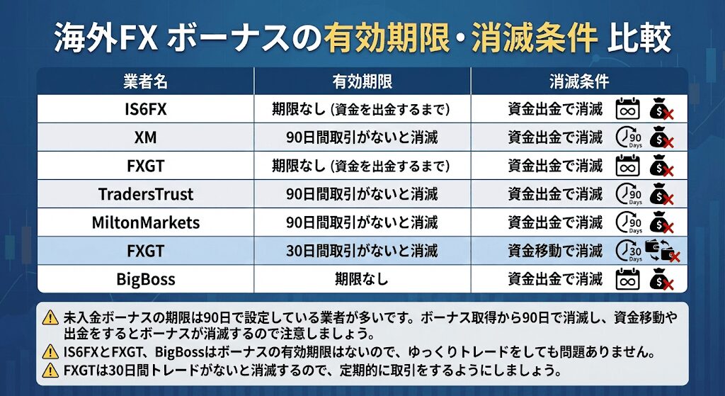 IS6FXとFXGT、BigBossはボーナスの有効期限はないので、ゆっくりトレードをしても問題ありません。