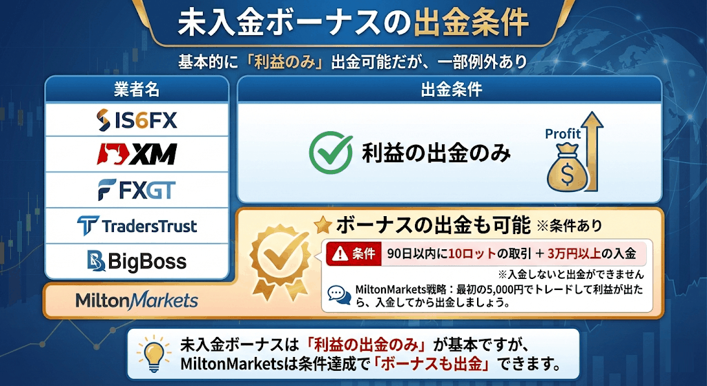 (MiltonMarketsは入金が条件になりますが、ボーナス自体の出金も可能です)
