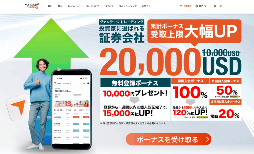 Vantageの口座開設ボーナスは常時開催となり、金額は1.5万円になります。