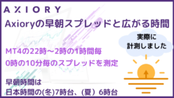 Axiory Axioryの早朝スプレッド一覧 スプレッドの広がる時間帯 Axioryの早朝スプレッドを知りたい人向けに、実際に早朝時のスプレッドを計測しました。MT4時間の22時~2時までの1時間ごとの平均スプレッドと、0時台の10分ごとの平均スプレッドを公開しますので、朝スキャトレードなどで活用してください。... 2025.10.10 Axioryスプレッド