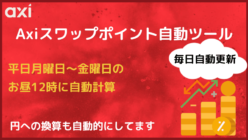 Axi Axiのスワップポイント一覧・ランキング(自動計算ツール) Axiのスワップポイントの自動計算ツールです。月曜日~金曜日のお昼の12時に毎日自動更新となります。ランキングとスワップポイント一覧は、自動的に円に換算されて表示するようにしています。↓以下のページでは各業者のスワップポイント比較を載せてい... 2025.10.10 Axiスワップポイント