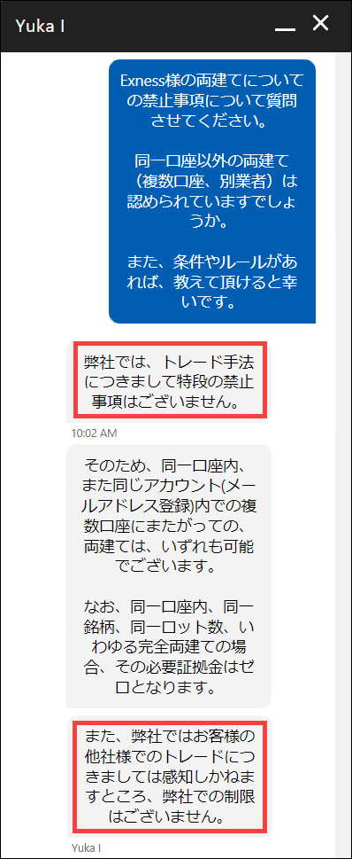 Exnessは両建てに関する禁止事項はなく、同一口座内での両建てだけでなく、複数口座や別業者を使った両建ても認められています。