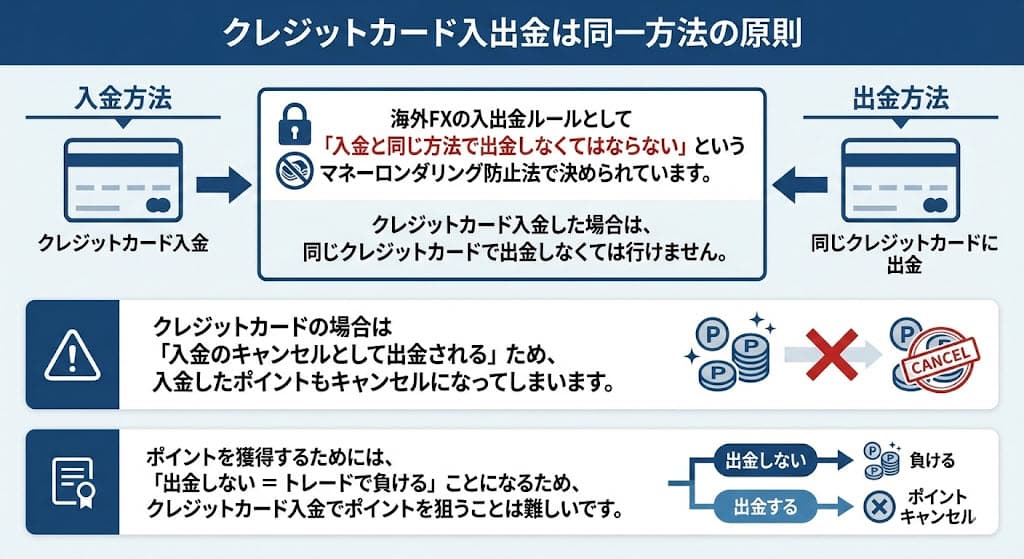 ポイントを獲得するためには、「出金しない = トレードで負ける」ことになるため、クレジットカード入金でポイントを狙うことは難しいです。