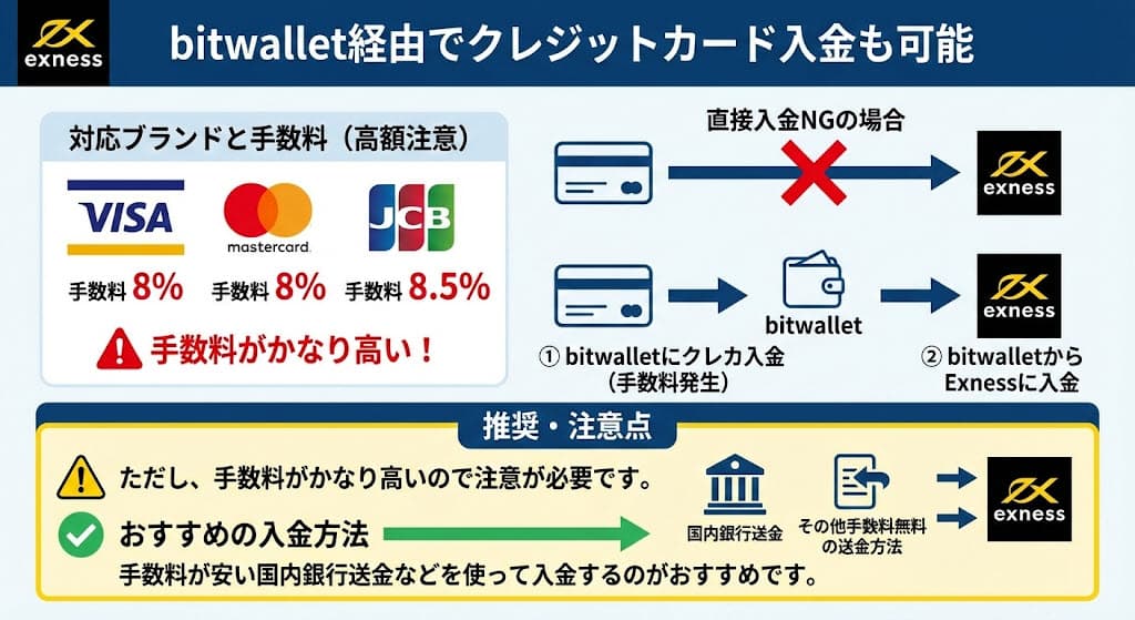 Exnessに直接クレジットカード入金ができなかった場合、bitwalletにクレジットカード入金をして、bitwalletからExnessに入金する方法もあります。
