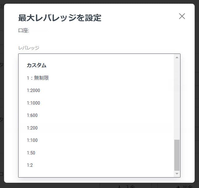 Exnessではこの8種類のレバレッジが選べ、「カスタム」を選択することで2倍~レバレッジを決めることができます。