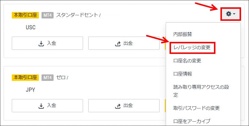 Exnessにログインをして、設定マークから「レバレッジ変更」をクリックしましょう。