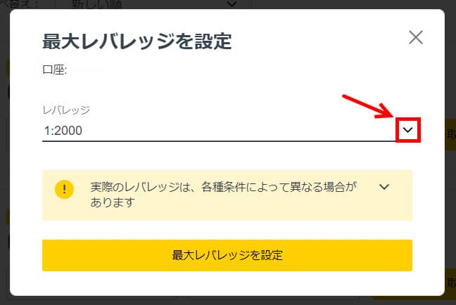 逆三角のマークをクリックして、レバレッジを設定しましょう。