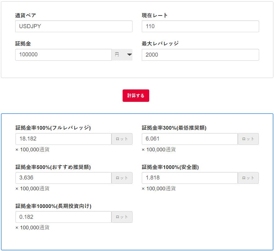 海外FX レバレッジ計算機を使うと、金額ごとに購入できるロット数を計算してくれます。
