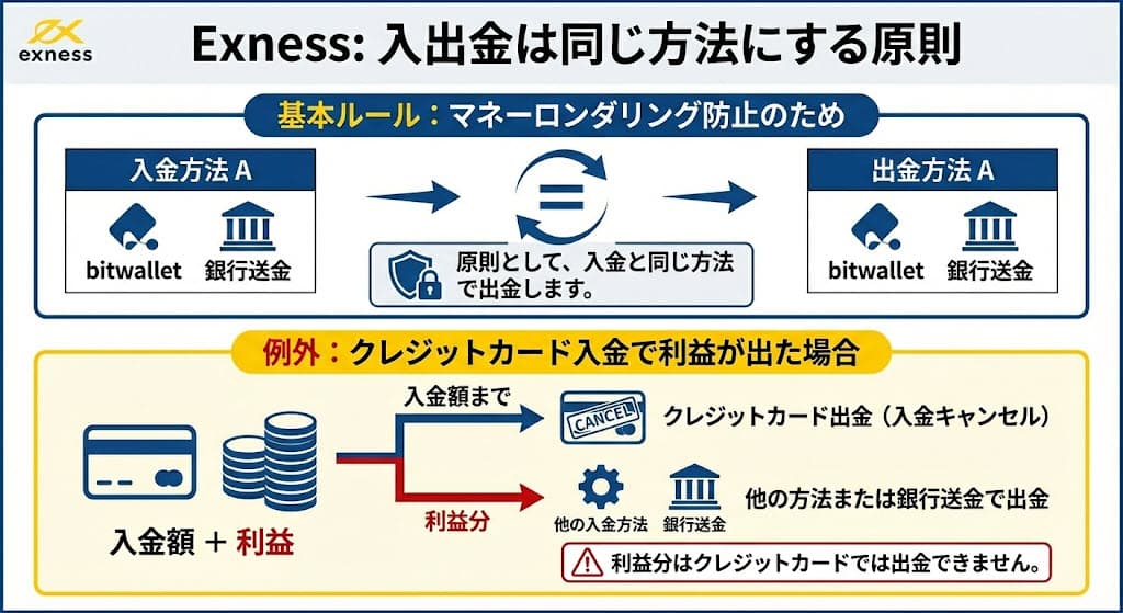 Exnessの入出金は基本的に「入金と出金を同じ方法にする」ことが前提となり、マネーロンダリング防止のために決められています。