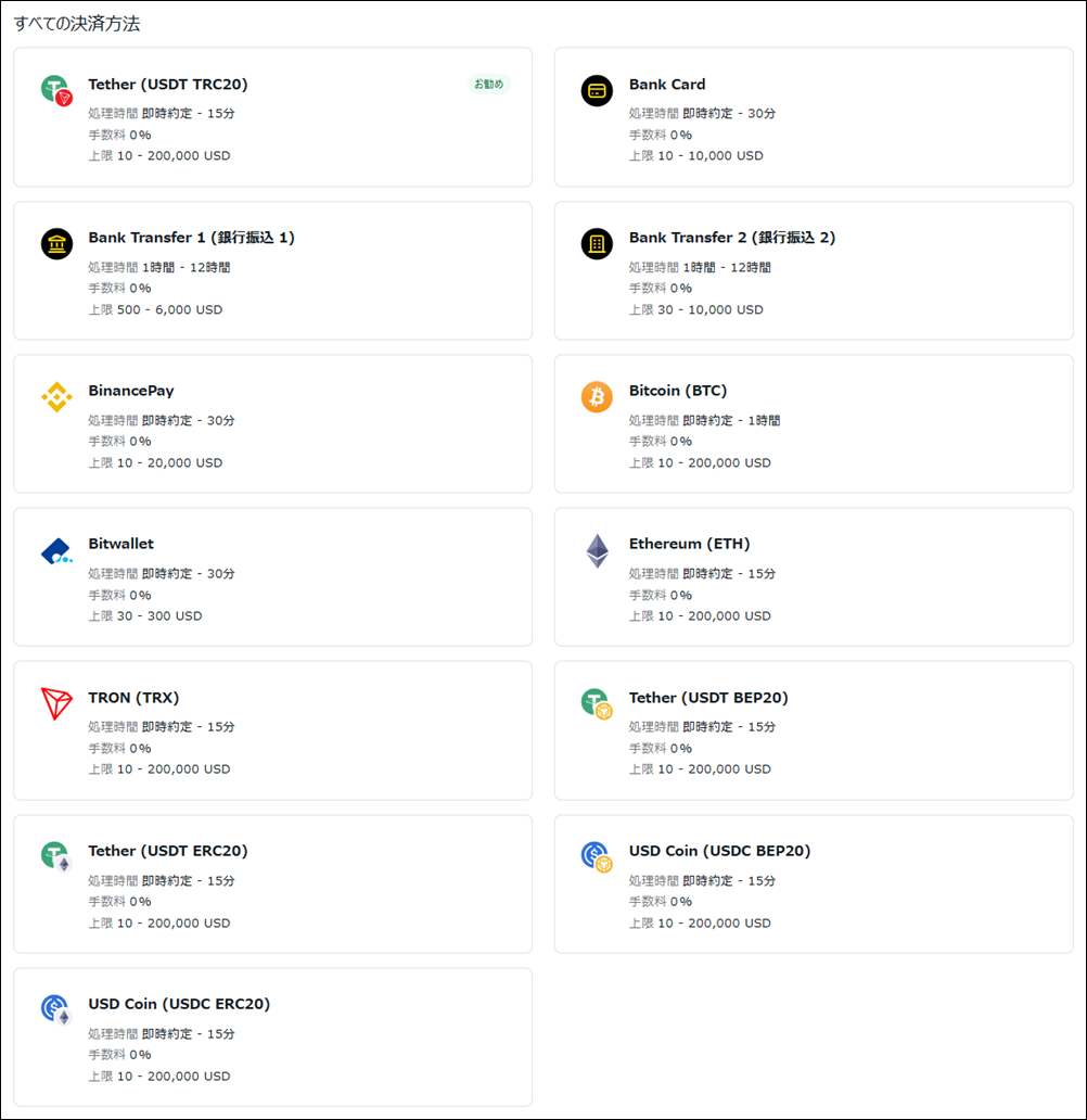 仮想通貨はBTCやETH、USDT、TRXなどで入金可能です。