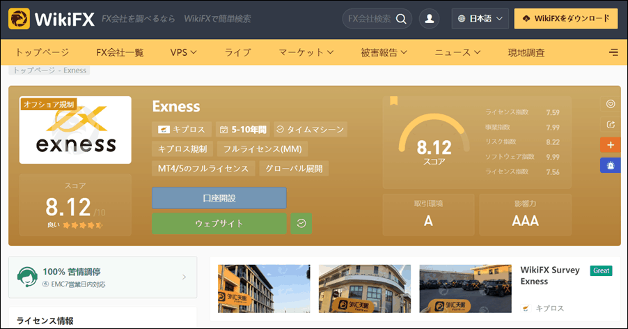 海外のFX業者評価サイトのWikiFXを見ると、Exnessは非常に高評価で、真相公開(クレーム)は特にありませんでした。