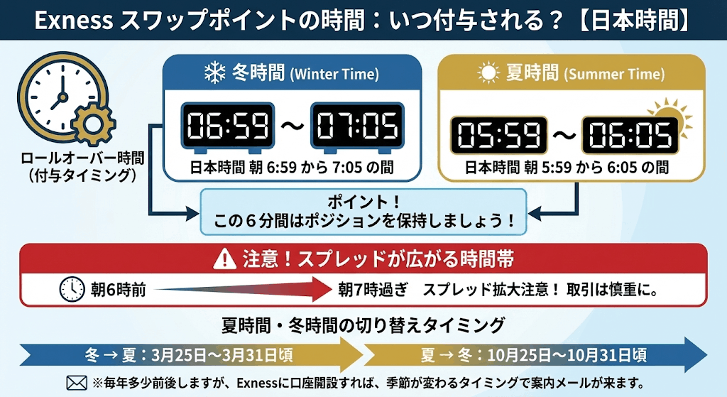 Exnessのスワップポイントが付与されるタイミングは朝方の「ロールオーバー」時間となります。
