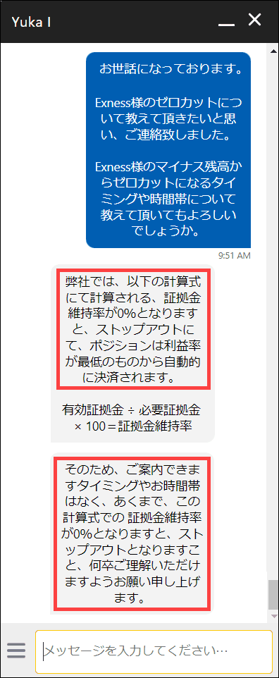 過去の実績や公式サイトに書かれているので問題ないと思いますが、ゼロカットのタイミングを知りたかったのもあり、Exnessに直接問い合わせてみました。