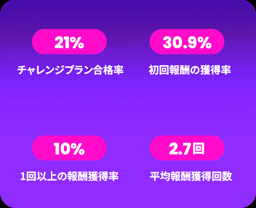 | チャレンジプラン合格率 | 初回報酬の獲得率 | 1回以上の報酬獲得率 | 平均報酬獲得回数 |