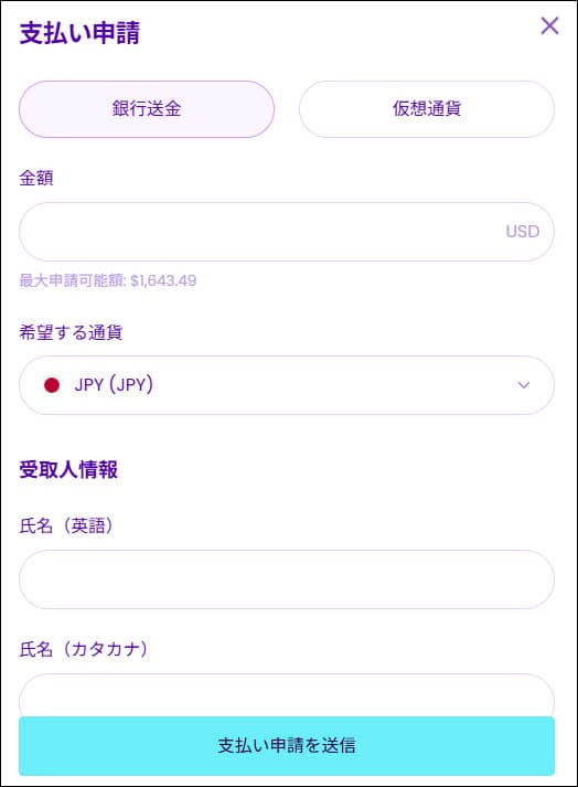 Fintokeiの報酬を出金する場合は、仮想通貨または国内銀行送金を選ぶことが可能です。