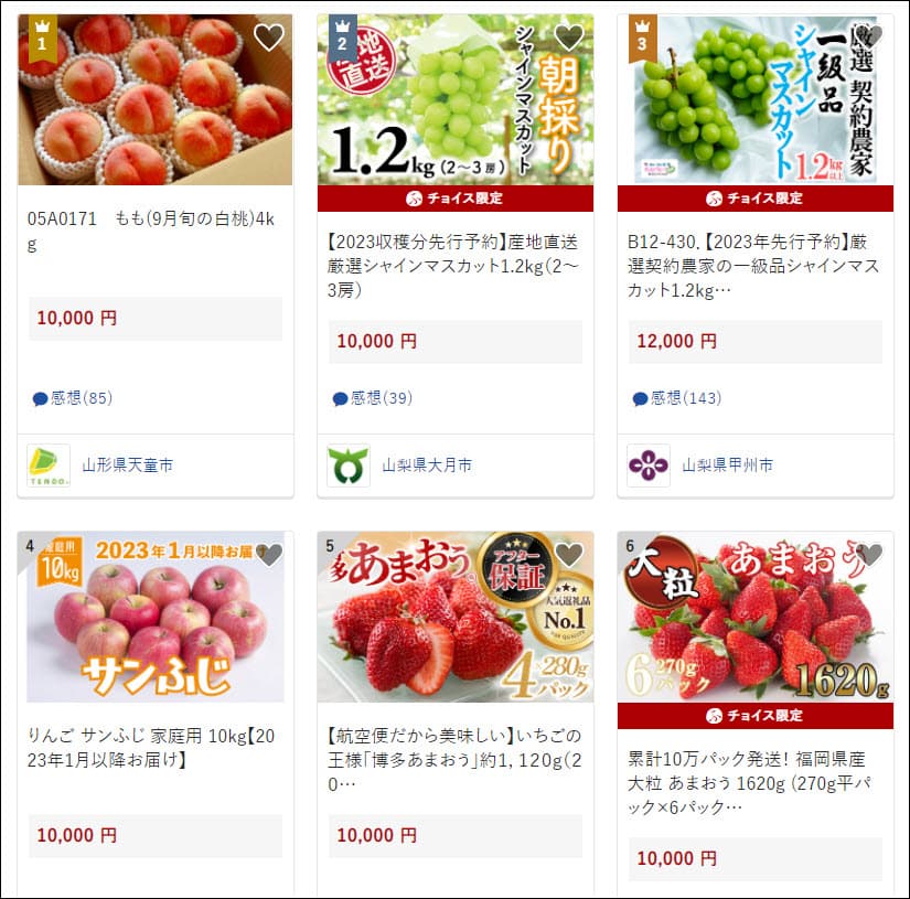 時期によっては旬の野菜やフルーツなどももらえるので、普段買わない高級なフルーツやお肉をもらったり、保存の効く食品を購入するのがおすすめです。