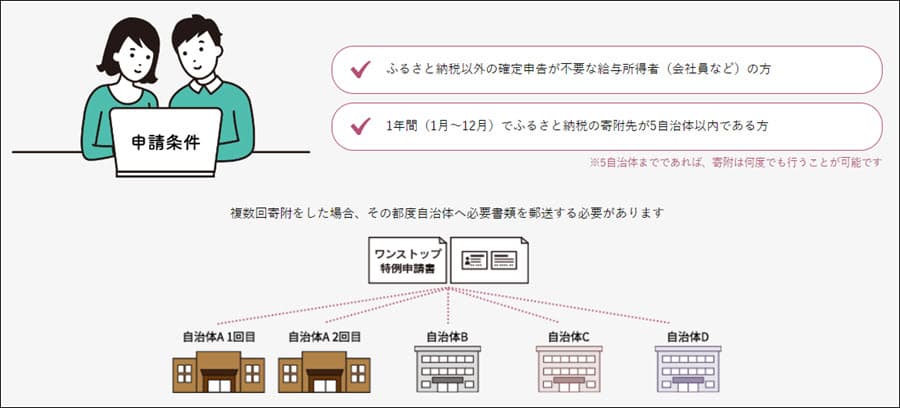 1年間で5つ以内の自治体への寄附が条件となりますが、申告用紙と指定の身分証明書を寄付先の自治体に送る必要があります。