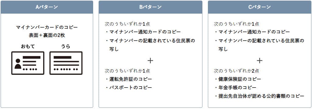身分証明書はマイナンバーカードの表裏の組合せか、通知カードまたは住民票の写し+免許証またはパスポート、通知カードまたは住民票の写し+健康保険証のコピーまたは年金手帳のコピーまたは公的書類のコピーが必要です。
