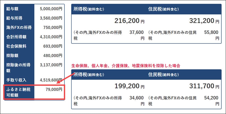 ふるさと納税の計算方法は非常に複雑なため、上記の表を参考にして頂くか、以下の税金計算ツールにふるさと納税額が表示されるようになっているので、参考にしてください。