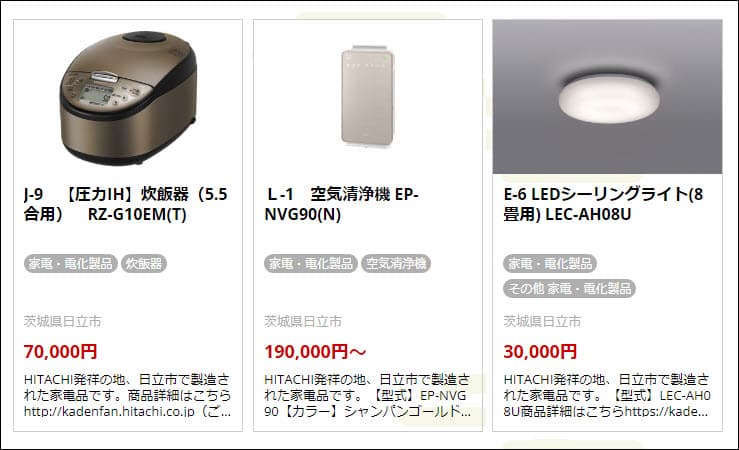 例えばふるさとプレミアムで茨城県日立市に寄付をすると、HITACHIの家電が返礼品としてもらえます。